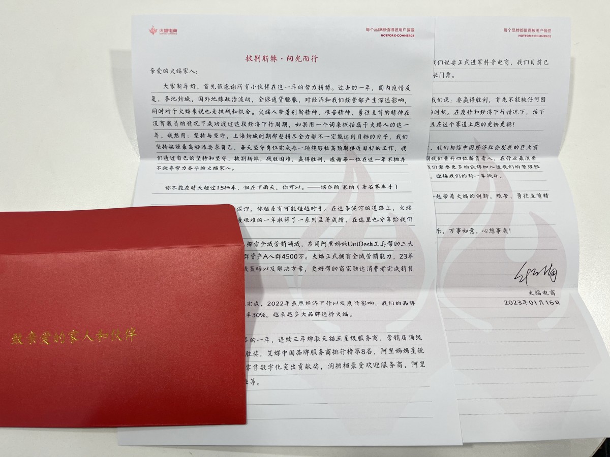 隨著新春的臨近,一整年的工作逐漸進入尾聲,火蝠電商向所有員工下發(fā)了新春賀禮年貨禮盒,同時也送上了火蝠電商CEO鐘雨清親自書寫的家書一封,千字篇語皆是直抒胸臆的真情實感。